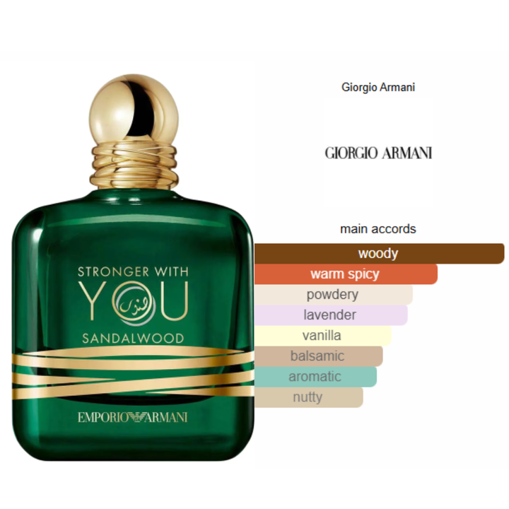 Stronger With You Sandalwood by Giorgio Armani is a luxurious oriental–woody unisex fragrance launched in 2025. This elegant scent blends warm spices, creamy woods, and aromatic notes, making it perfect for anyone who wants a long-lasting and sophisticated perfume with a modern touch.